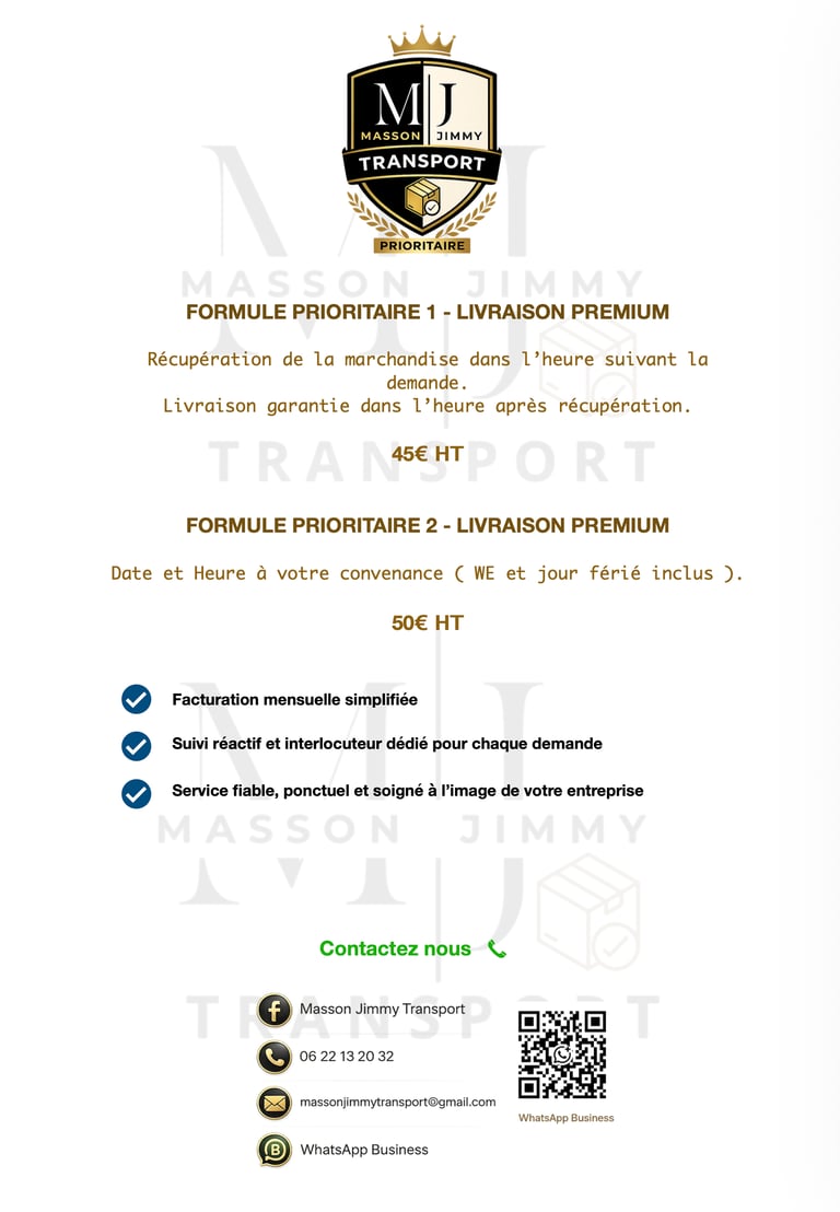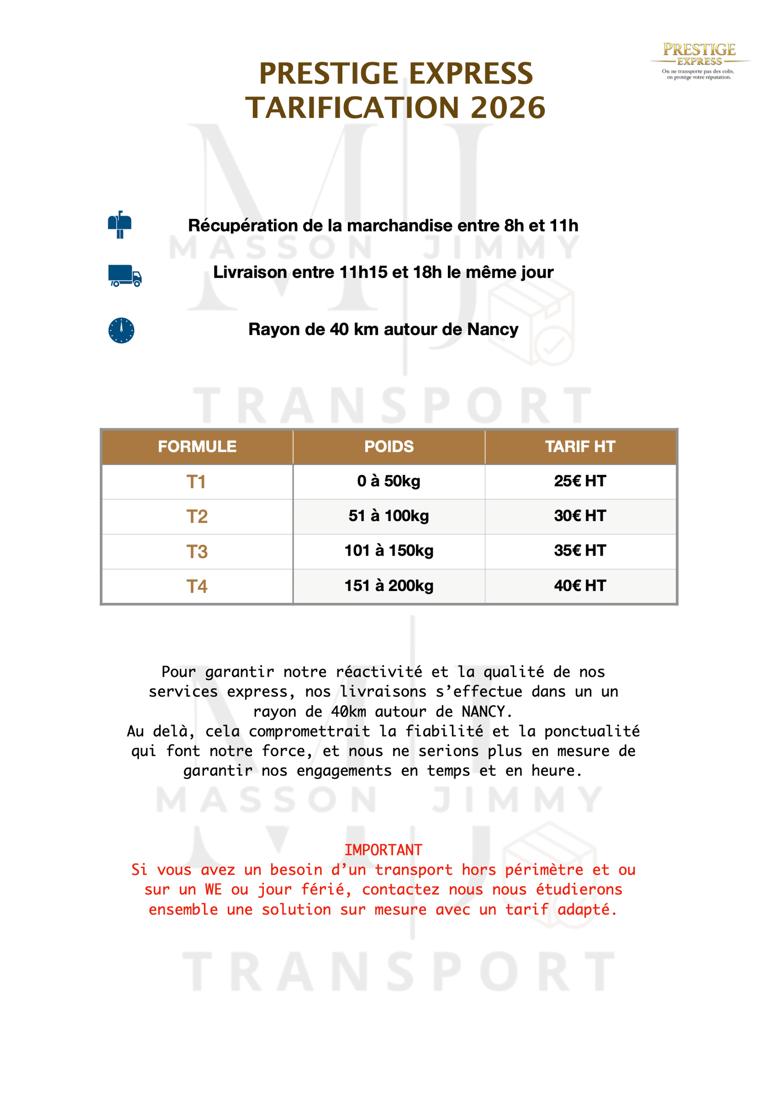 Prestige Express, c’est l’extension premium de MASSON JIMMY TRANSPORT, conçue pour les commerçants exigeants de Nancy et de ses alentours. Nous ne livrons pas de simples colis, nous portons la réputation de votre commerce entre nos mains. Notre offre, c’est une livraison ultra-rapide, soignée et personnalisée, adaptée à vos besoins spécifiques. Chaque livraison est un engagement : ponctualité, respect de vos attentes et protection de votre image. Avec Prestige Express, vous bénéficiez d’un partenaire de confiance, dédié à votre sérénité, jour après jour. Découvrez nos prestations exclusives et réservez vos livraisons en toute tranquillité. Nous sommes là pour que chaque expédition devienne synonyme d’excellence. Prestige Express, c’est l’assurance d’une livraison qui va au-delà du simple transport.